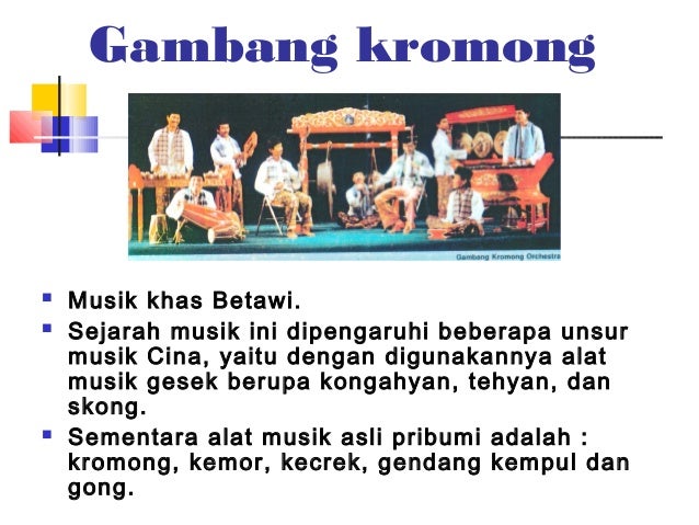 13 makanan khas betawi dan cara membuatnya. Siter dan celempung merupakan alat musik petik yang berada di dalam gamelan jawa. Ada juga yang menyebut orkes ini termasuk dari tradisi cina benteng alat musik yang digunakan yang berupa alat musik campuran antara suku pribumi dengan tionghoa, seperti yaitu sukong, tehyan, dan kongahyan. Gamang kromong memanfaatkan alat musik tradisional khas betawi dalam sebuah pertunjukkannya. Strategi adaptasi kelompok musik gambang kromong dalam menghadapi perubahan sosial ( studi kasus kelompok musik gambang kromong mustika forkabi. Gambang kromong adalah sebuah orkes musik yang berisi bserbagai macam alat musik tradisional jakarta. Lagu yang dimainkan dengan alat musik ini kebanyakan berupa humor, syair bernuansa semangat dan kegembiraan serta kadang berupa sindiran sarkasme. Namun seiring berjalannya waktu, masyarakat lokal mulai tertarik dengan kesenian tersebut sehingga mulai tersebar dan. Meski demikian, perubahan ini tidak menghilangkan kekhasan musik gambang kromong. Musik gambang kromong yang sudah dikenal pada tahun 1880 pada Terdapat juga hubungann dengan kecapi dalam gamelan sunda. Anda bisa mencari produk ini di toko online yang mungkin jual alat musik gambang kromong. Gambar alat musik gambang kromong dipostkan pada 22 november 2018 11.44 pada kategori musik gambang kromong dengan beberapa pembahasan gambar alat dan informasi tentang musik gambang kromong gambar alat dan serta info yang berkaitan lainnya.