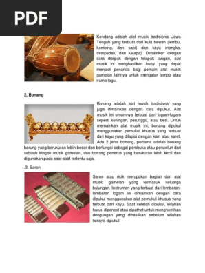 Alat musik ini terbuat dari bambu yang dipotong bagian ujungnya. Namun, kita juga bisa menemukan gendang ini di daerah lampung, yang menjadi alat musik tradisional setempat dari dulu. Gamelan selalu dimainkan oleh beberapa orang dengan beberapa alat musik berbeda dan dimainkan bersama seperti orchestra. Seiring dengan perkembangan jaman, bahan baku pembuatan alat musik gesek lebih modern, ada yang menggunakan plastik dan hampir. Keistimewaan alunan musik gamelan jawa adalah cenderung bersuara lembut. Dengan keterampilan dan tingkat seni yang tinggi bahan bahan tersebut menjadi alat musik yang istimewa dan memiliki nilai yang sangat tinggi. Gamelan adalah sebuah musik ensambel tradisional yang populer di wilayah jawa, sunda, dan bali. Gamelan menggunakan skala nada pentatonis dalam sistem skala nada (laras) slendro dan pelog. Dan biasanya bonang digunakan untuk memperingati upacara adat setempat. Gamelan merupakan kumpulan alat musik yang menonjolkan demung, peking, kendang, saron dan gong. Bahan pembuatan gong sendiri adalah logam kuningan dan dibuat dengan ukuran yang variatif. Kesalahan umum yang diperlu diluruskan adalah bahwa gamelan bukanlah alat musik, melainkan sajian musik. Alat musik tradisional jawa ini juga merupakan alat musik ritmis yang dimainkan sebagai pengatur irama.