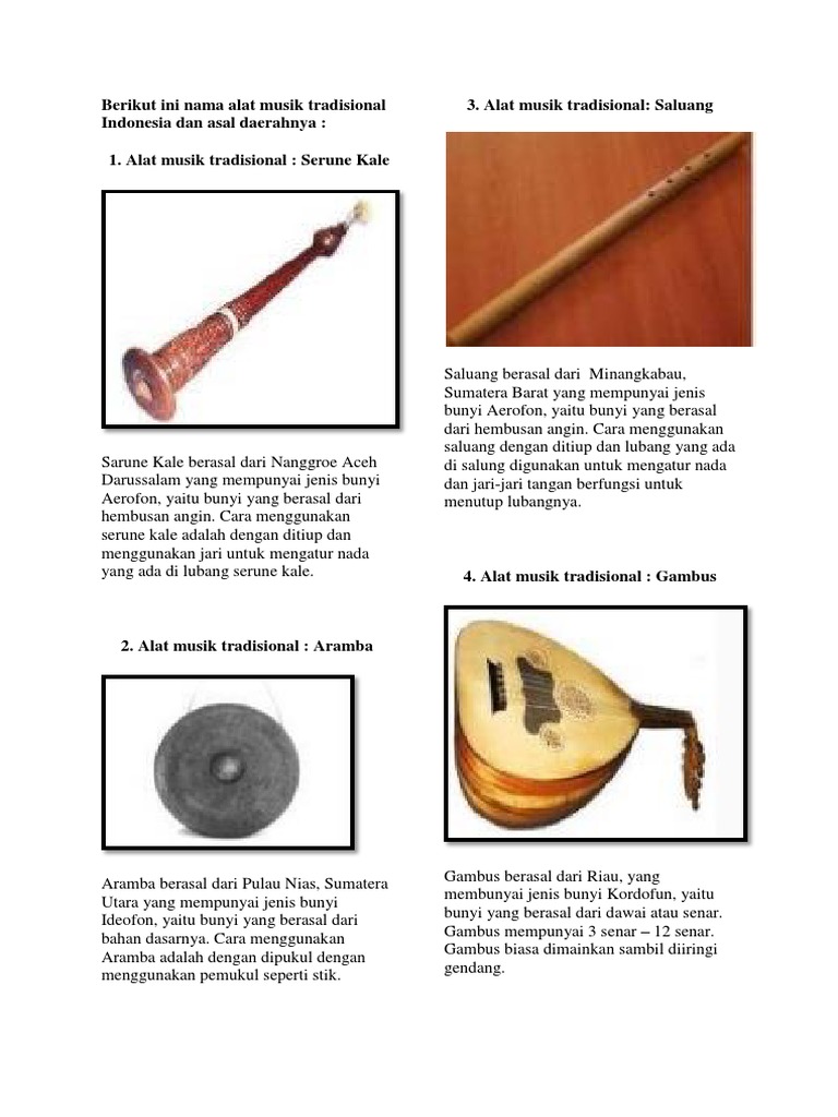 Fungsi dari alat musik ini lebih dominan sebagai kode atau isyarat bagi masyarakat setempat. Yang anda lihat mungkin hanya sebagian kecil dari kategori alat musik tiup. Gambar alat musik tradisional sumatera barat saluang. Saluang terbuat dari bambu tipis yang disebut dengan talang. Namun, jika dalam kebudayaan sunda, alat musik suling terbuat dari bambu dan memilik empat hingga enam lubang sebagai pengatur melodi dari yang hasilkan oleh alat musik tiup ini. Terbangan adalah alat musik yang terdiri dari 4 buah rebana dan dimainkan dengan cara dipukul. Celempung terbuat dari kulit bambu dengan memanfaatkan resonansi yang ada dalam ruas batang bambu untuk menghasilkan suara. Ada banyak jenis alat musiknya yang menarik untuk dikenali oleh siapa saja, tidak hanya mereka yang sedang belajar di sekolah atau perguruan tinggi. Saluang saluang adalah alat musik tradisional khas minangkabau,sumatra barat. Karinding daapt terbuat dari bambu ataupun. Angklung adalah alat musik tradisional berasal dari jawa barat. Serunai adalah alat musik yang bisa dimainkan secara solo ataupun beriringan dengan alat musik lainnya dalam sebuah pertunjukan musik. Talempong berasal dari sumatera barat yang cara memainkannya dengan dipukul menggunakan kayu.